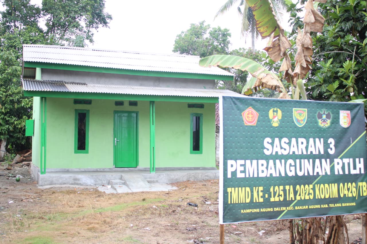 Tulang Bawang, 19 Agustus 2025 — Kegembiraan meliputi warga Kampung Agung Dalam, Kecamatan Banjar Agung, setelah rumah milik salah seorang warga yang menjadi sasaran 3 TMMD ke-125 Kodim 0426 dinyatakan selesai direhab. Proses pembangunan RTLH itu kini tuntas 100 persen.