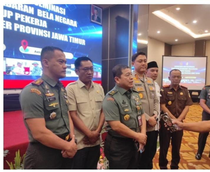 Kementerian Pertahanan Republik Indonesia menggelar Sosialisasi Pembinaan Kesadaran Bela Negara Lingkup Pekerja di Kabupaten Jember Provinsi Jawa Timur dalam rangka menyebarluaskan Nilai Dasar Bela Negara. Amanat Direktur Jenderal Potensi Pertahanan Laksda TNI Sri Yanto yang dibacakan Direktur Bela Negara Ditjen Pothan Kemhan Brigadir Jenderal TNI G.Eko Sunarto, S.Pd., M.Si dihadapan peserta Sosialisasi Pembinaan Kesadaran Bela Negara Lingkup Pekerja pada saat pembukaan Sosialisasi di Hotel Aston Jember. Dalam sambutannya Dirjen Pothan Laksda TNI Sri Yanto menyampaikan bahwa Bela Negara tidak hanya menjadi tanggung jawab Kementerian Pertahanan dan TNI semata, tetapi menjadi tanggung jawab bersama seluruh Kementerian/Lembaga termasuk Pemda serta seluruh komponen bangsa lainnya. Bela Negara bagi lingkup pekerja merupakan bagian dari upaya membangun sikap mental dan karakter bangsa serta merupakan kegiatan yang tidak terpisahkan dari Asta Cita Kabinet Merah Putih serta membangun revolusi mental. Kegiatan ini bertujuan untuk membangun dan menanamkan sikap mental dan perilaku warga negara untuk senantiasa cinta kepada tanah air,memiliki kesadaran berbangsa dan bernegara, setia pada Pancasila sebagai idiologi negara, rela berkorban untuk bangsa dan negara serta memiliki kemampuan awal bela negara. Menghadapi dinamika perkembangan ancaman nyata menunjukkan bahwa kualitas sumber daya manusia menjadi penentu bagi keberlangsungan bangsa dan negara. Sumber daya manusia tidak hanya menguasai ilmu pengetahaun dan tehnologi, tetapi juga harus memiliki kesadaran bela negara yang kuat, salah satu upaya yang dilakukan dengan melaksanakan Pembinaan Kesadaran Bela Negara. Disisi lain, Bupati Jember diwakili oleh Ketua DPRD Kab Jember H. Ahmad Halim, S.Sos juga mengatakan bahwa sebagai daerah yang terus berkembang, Pemerintah Kabupaten Jember telah mengambil langkah-langkah yang bertujuan untuk melibatkan warga secara proaktif berpartisipasi menyampaikan perkembangan di wilayahnya masing-masing dan nantinya akan menjadi bagian dari upaya untuk membangun dan menciptakan konsolidasi, koordinasi, sinergi serta integrasi penyelenggaraan Pembinaan Kesadaran Bela Negara.Hadir dalam acara pembukaan Sosialisasi dan Diseminasi Pembinaan Kesadaran Bela Negara Lingkup Pekerja adalah para pejabat Forkopimda Kabupaten Jemberdan para Narasumber dengan peserta Lingkup pekerja yang yang hadir dari ASN, Pegawai BUMN, BUMD, Swasta serta PNS TNI dan Polri.Narasumber pada kegiatan Sosialisasi dan Diseminasi Pembinaan Kesadaran Bela Negara di lingkup Pekerja TA. 2025 kali ini, dari Kementerian Pertahanan adalah Kolonel Adm Amiruddin Laupe Kasubdit Lingja, Kolonel Arm Agus Junaidi Analis Kebijakan Madya Bidang Tekpol Ditbelneg Ditjen Pothan Kemhan RI dengan materi Nilai Dasar Bela Negara dan Sishankamrata, Kanwil Kemenag Kab. Jember dengan materi moderasi Beragama dan Bela Negara, Kadiskominfo Kab Jember dengan materi Bijak Dalam Bermedia Sosial dan dari Kaban Kesbangpol Kabupaten Jember dengan materi Peran kearifan lokal dalam Bela Negara.