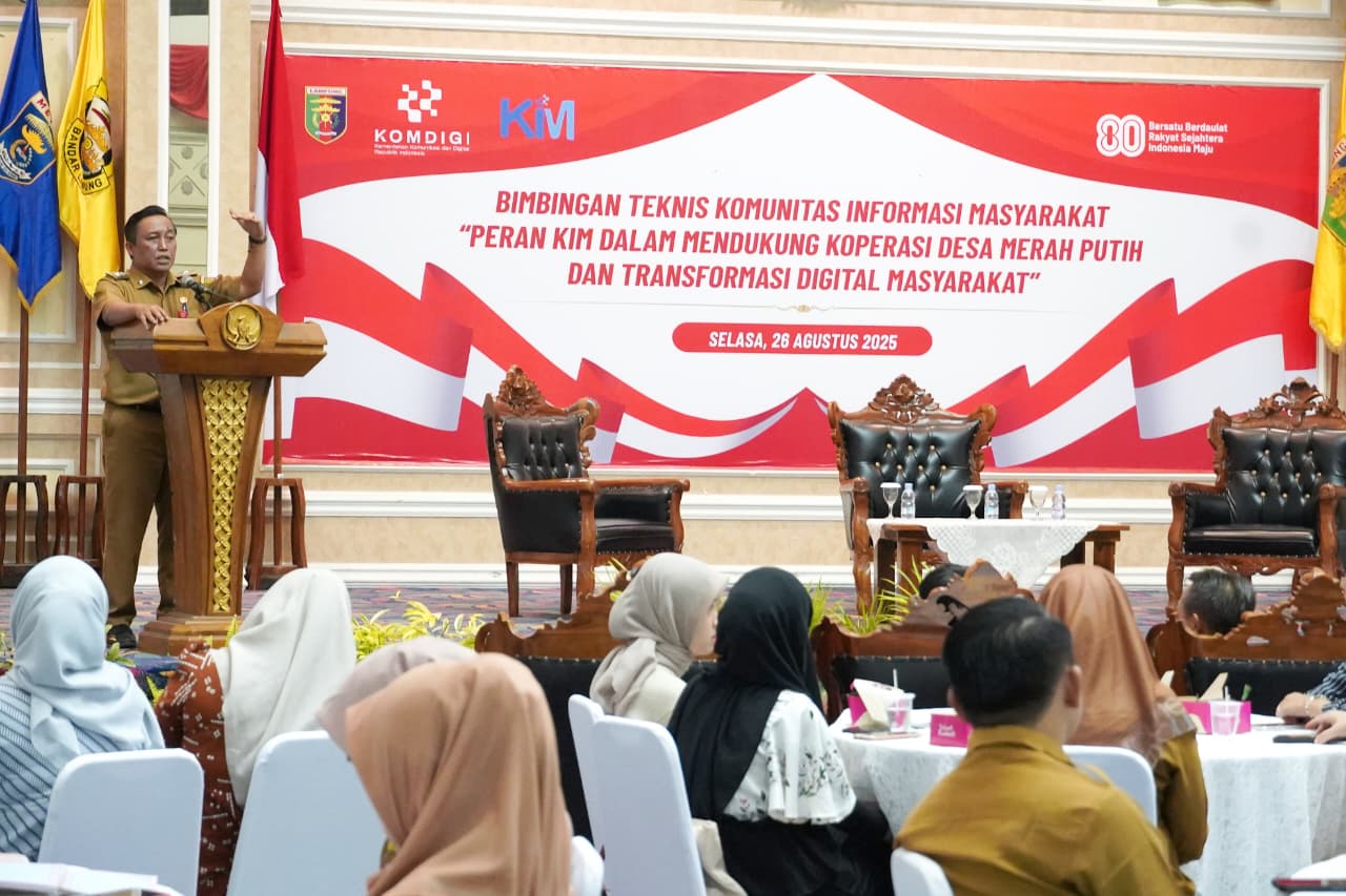 Pemerintah melalui Kementerian Komunikasi dan Digital (Komdigi) bersama Dinas Kominfotik Provinsi Lampung menggelar Bimbingan Teknis (Bimtek) Komunitas Informasi Masyarakat (KIM) di Balai Keratun, Lantai 3, Selasa (26/8/2025).