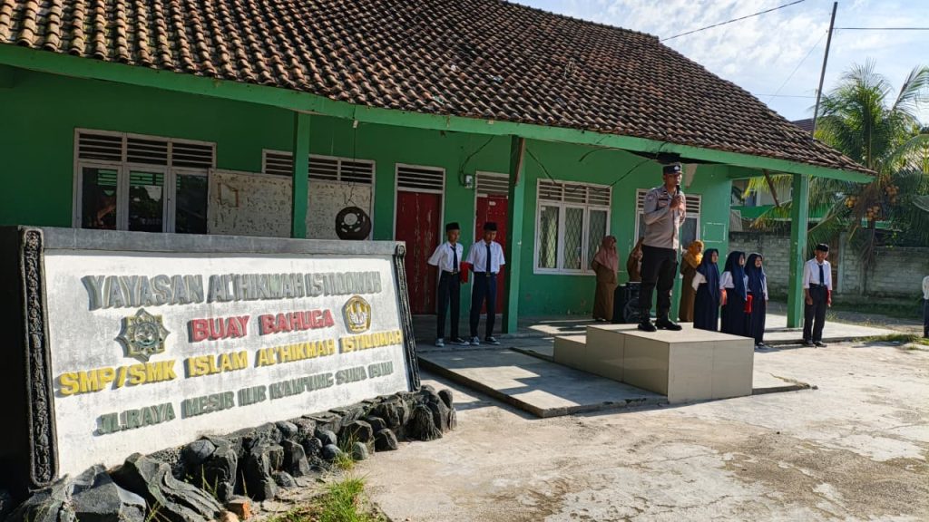 Kanit Binmas Polsek Buay Bahuga Polres Way Kanan Polda Lampung gelar police goes to school di SMK dan SMP Al-Hikmah Istiqomah di Kampung Suka Bumi Kecamatan Buay Bahuga Kabupaten Way Kanan. Rabu (17/09/2025).
