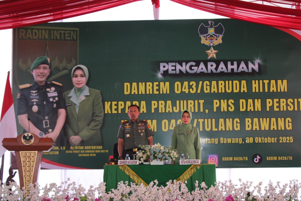 Menggala (Tulang Bawang) — Komandan Korem 043/Garuda Hitam, Brigjen TNI Haryantana, S.H., melaksanakan kunjungan kerja ke Makodim 0426 Tulang Bawang yang berlokasi di Jl. Lintas Timur Sumatera KM 113, Kampung Bujung Tenuk, Kecamatan Menggala, Kabupaten Tulang Bawang, pada Kamis, 30 Oktober 2025.