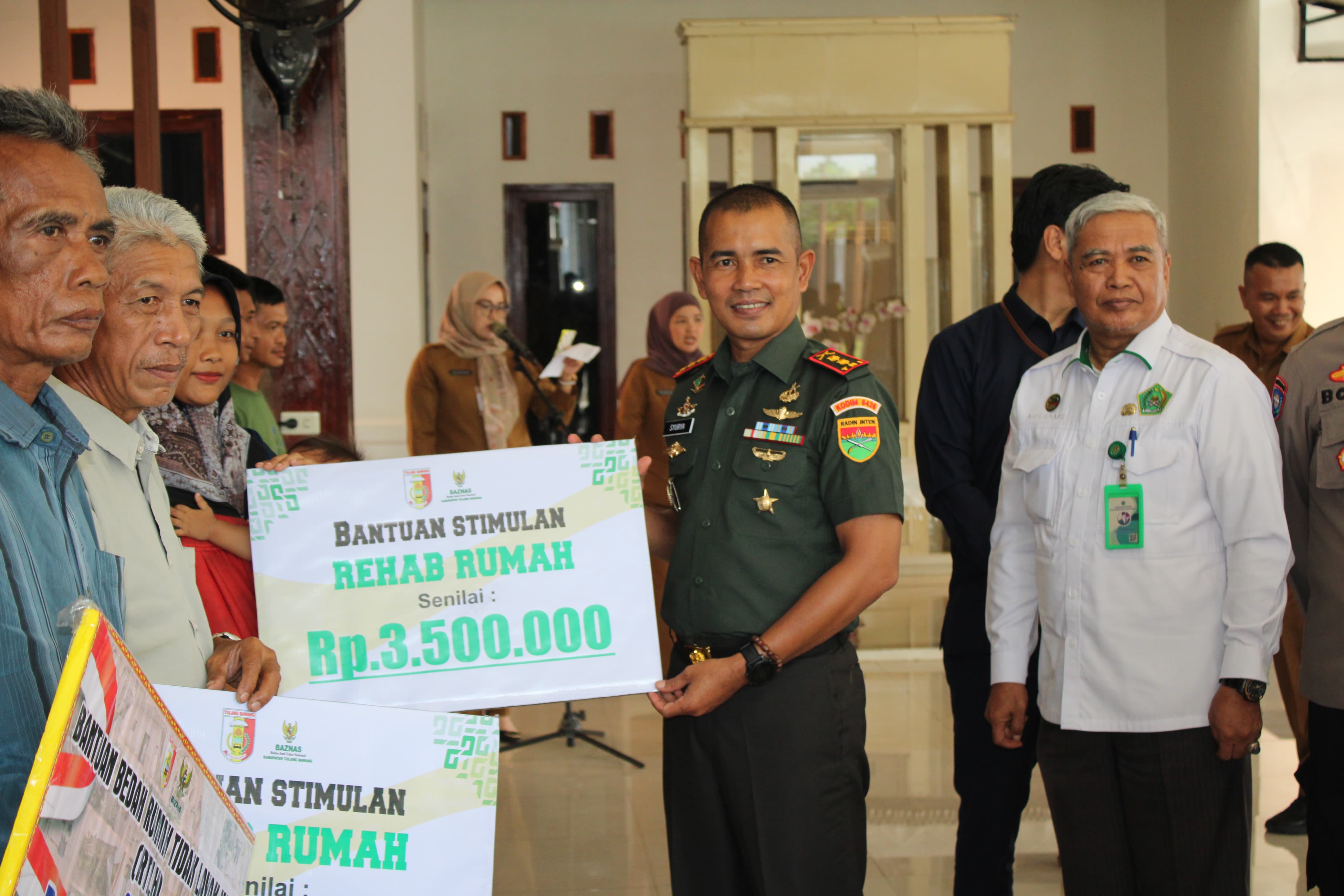 Menggala (Tulang Bawang) — Komandan Kodim 0426/Tulang Bawang Letkol Inf Syurya Dharma menghadiri kegiatan penyaluran bantuan Bedah Rumah dan bantuan ternak kambing oleh Pemerintah Kabupaten Tulang Bawang bekerja sama dengan Badan Amil Zakat Nasional (BAZNAS) Provinsi Lampung dan BAZNAS Kabupaten Tulang Bawang, Selasa 04 November 2025.