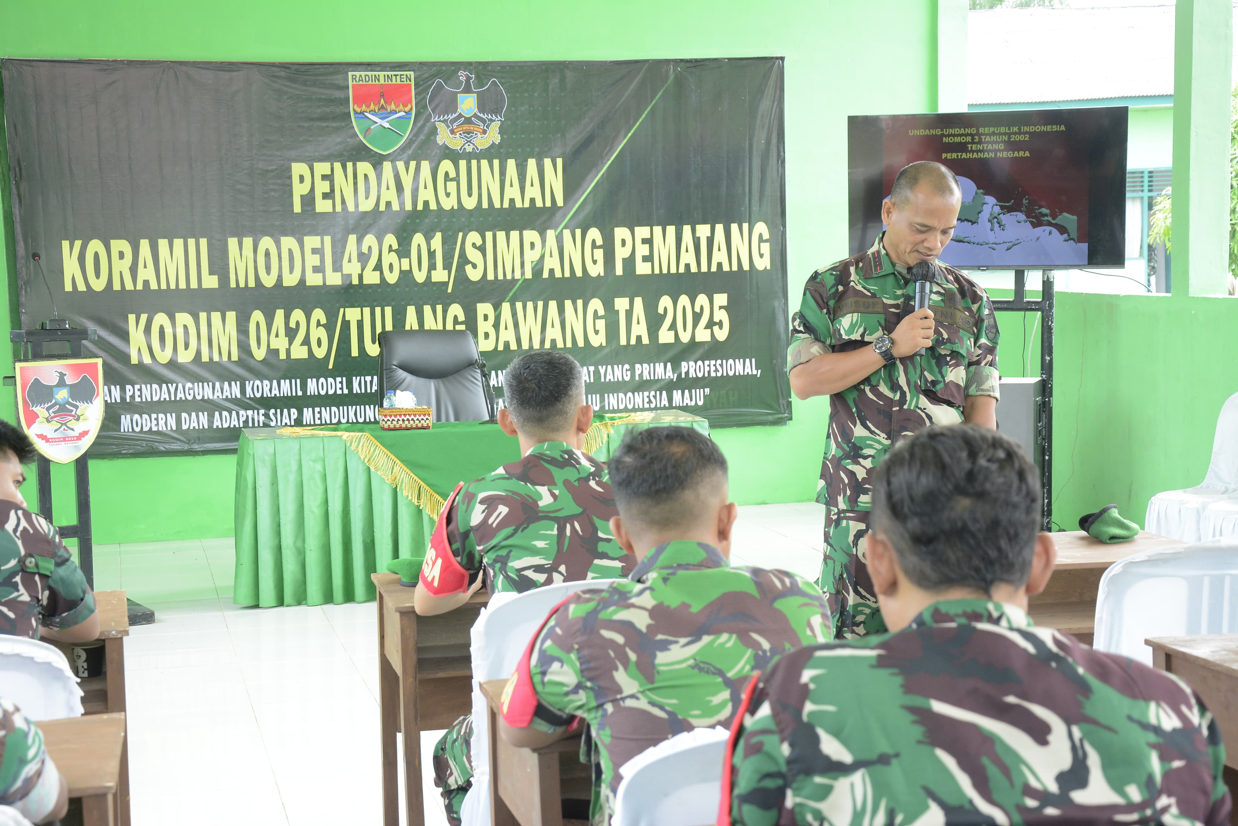 Simpang Pematang, (Mesuji) — Danramil 426-04/Banjar Agung, Kapten Inf M. Yusuf, memberikan materi wawasan hukum bagi prajurit dalam kegiatan Pemberdayaan Koramil Model Tahun 2025 yang berlangsung di Koramil 426-01/Simpang Pematang, Kecamatan Simpang Pematang, Kabupaten Mesuji, pada Rabu 12 November 2025.