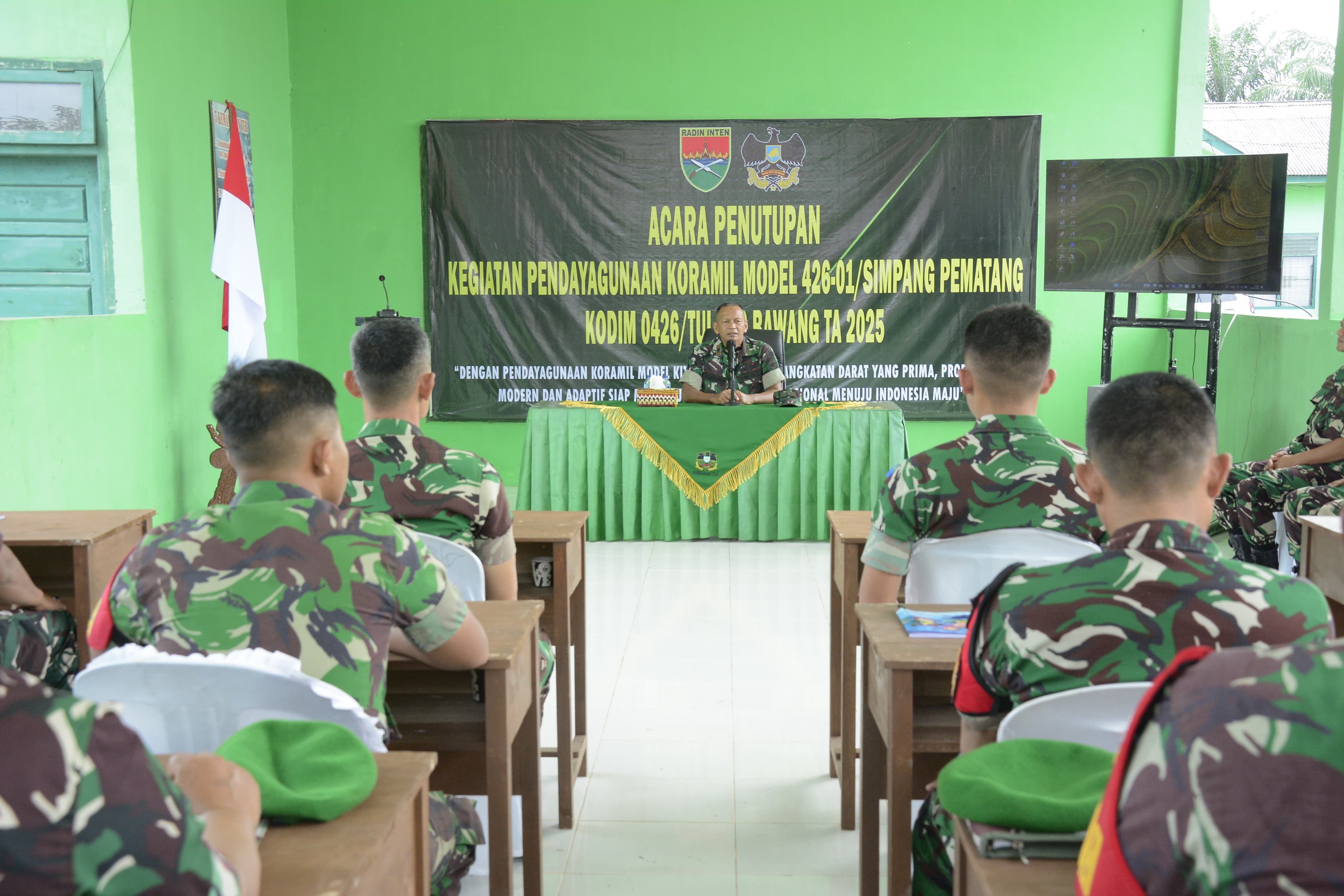 Simpang Pematang (Mesuji) — Pabung Kodim 0426/Tulang Bawang, Mayor Inf Arif Affuan, resmi menutup kegiatan Pendayagunaan Koramil Model Tahun Anggaran 2025 di Koramil 426-01/Simpang Pematang, Kabupaten Mesuji, Kamis (13/11/2025). Kegiatan ini diikuti perwakilan Babinsa dari jajaran Korem 043 Garuda Hitam.