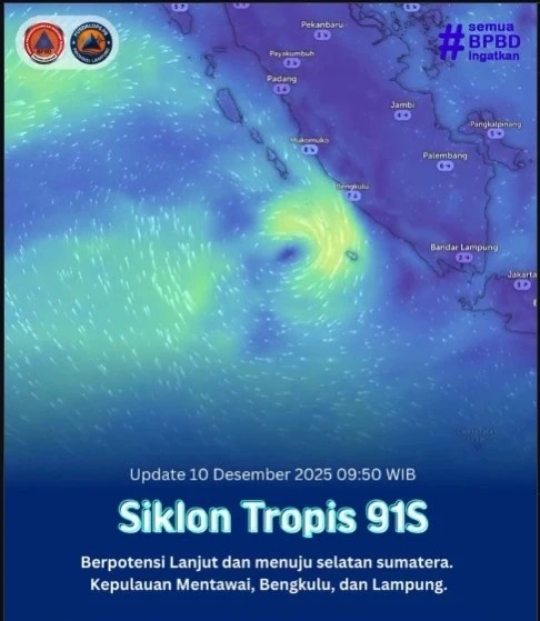 BMKG melaporkan bahwa Kamis (11/12/2025) dalam 24 jam ke depan, bibit siklon tropis 91S diperkirakan bergerak mendekati daratan Sumatera. Selanjutnya pada 36 hingga 72 jam mendatang, sistem ini diprediksi berbelok menuju barat daya dan menjauhi Pulau Sumatera.