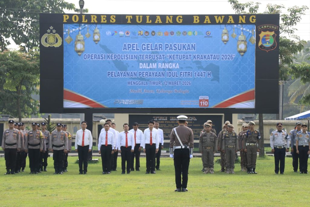 TULANG BAWANG, 12 MARET 2026 – Sebagai bagian dari upaya besar-besaran menjamin kelancaran dan keamanan masa mudik tahun ini, Polres Tulang Bawang bersama Personel Jajaran Umum (PJU) telah melaksanakan Apel Gelar Pasukan Operasi Ketupat Krakatau 2026 pada Hari Kamis (12/03/2026) pukul 08.00 WIB di Lapangan Hijau Polres Tulang Bawang. Kegiatan yang penuh semangat dan menunjukkan komitmen tak tergoyahkan ini dihadiri langsung oleh seluruh unsur Forkopimda dan instansi terkait Kabupaten Tulang Bawang.