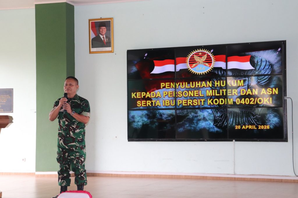 Dalam rangka meningkatkan pemahaman dan kesadaran hukum bagi prajurit, Aparatur Sipil Negara (ASN), serta anggota Persit Kartika Chandra Kirana (KCK), Kodim 0402/OKI-OI menggelar kegiatan penyuluhan hukum yang dilaksanakan di Aula Darmawangsa Kodim 0402/OKI-OI, Senin (20/04/2026).